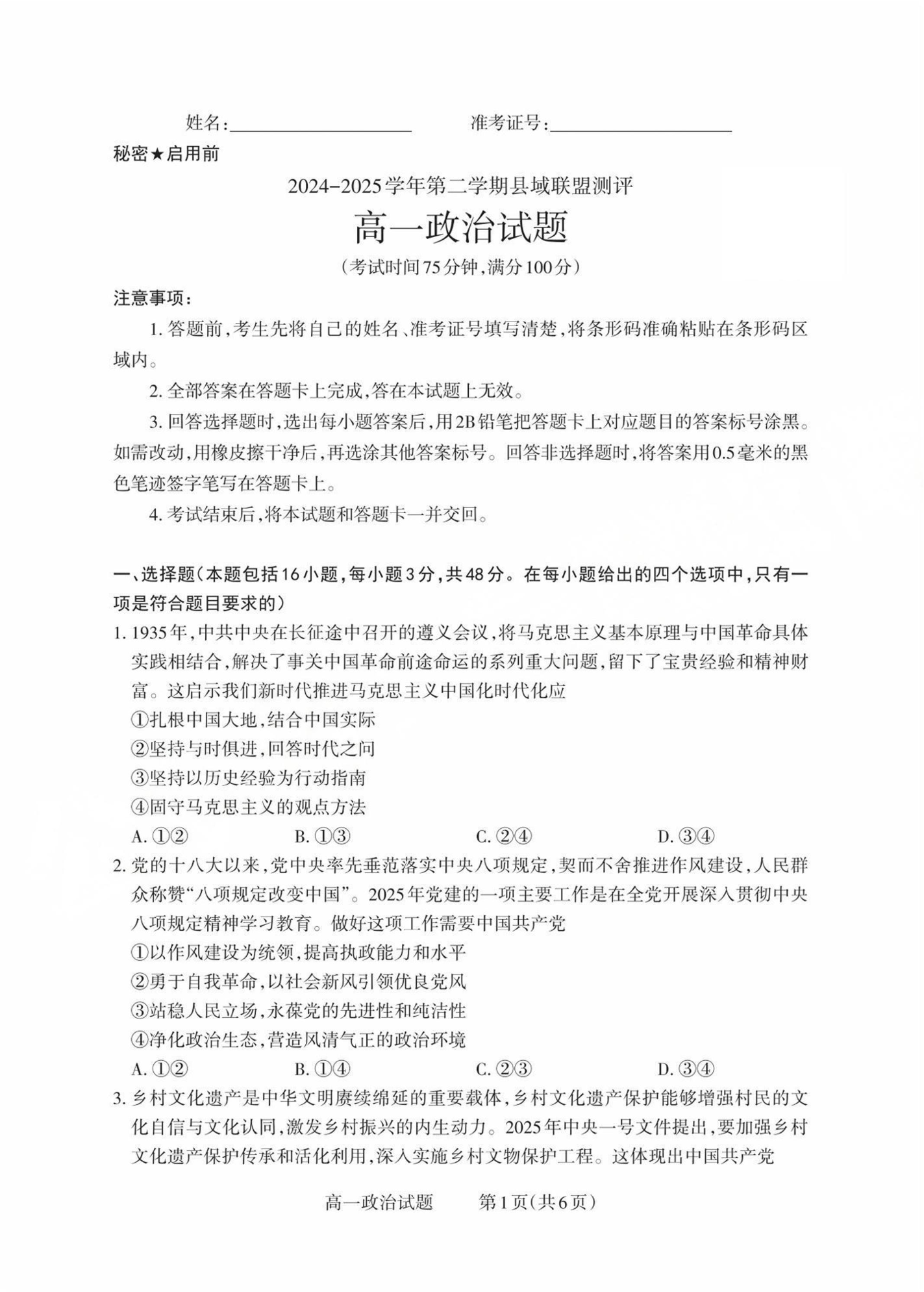 山西省县域联盟2024-2025学年高一下学期5月月考政治+答案