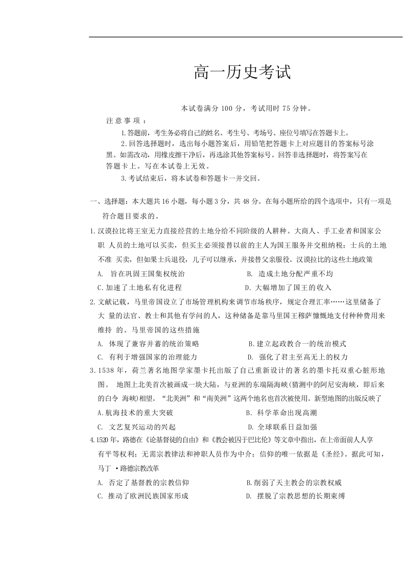 陕西省汉中市部分学校2024-2025学年高一下学期5月阶段性测试历史+答案