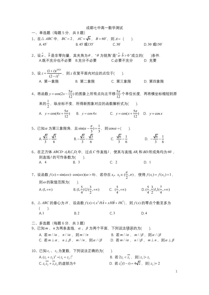 四川省成都市第七中学2024-2025学年高一下学期6月月考数学+答案