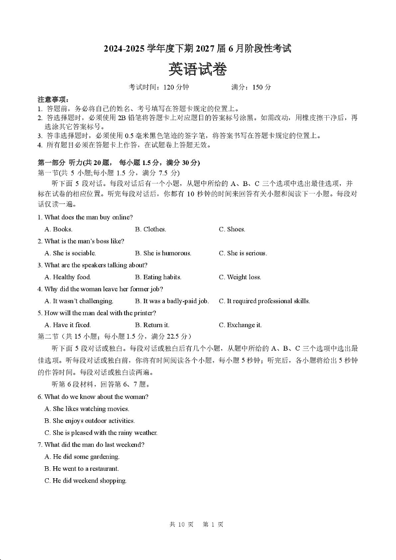 四川省成都市第七中学2024-2025学年高一下学期6月月考英语+答案