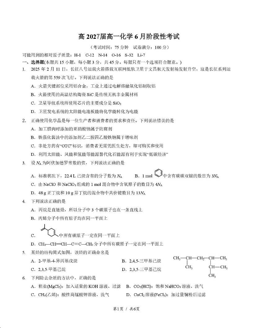 四川省成都市第七中学2024-2025学年高一下学期6月月考化学+答案