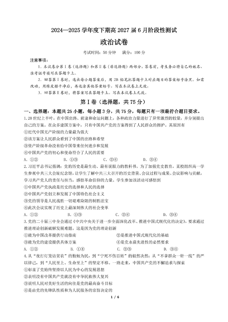 四川省成都市第七中学2024-2025学年高一下学期6月月考政治+答案