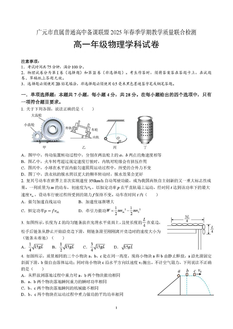 四川省广元市直属普通高中2024-2025学年高一下学期期中考试物理+答案
