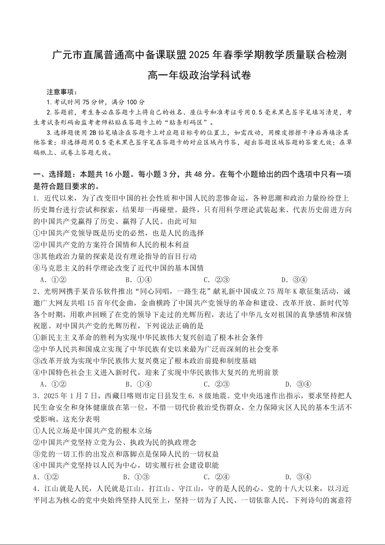 四川省广元市直属普通高中2024-2025学年高一下学期期中考试政治+答案