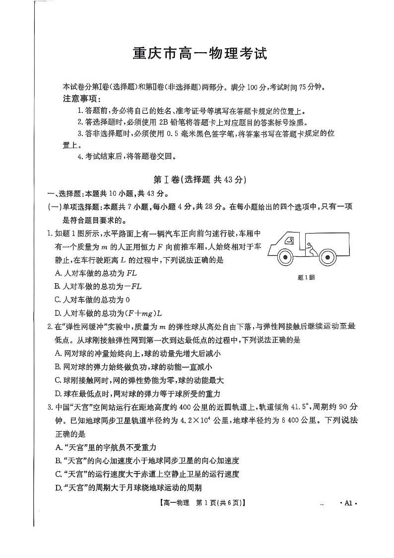 重庆市多校联考2024-2025学年高一下学期期中考试物理+答案