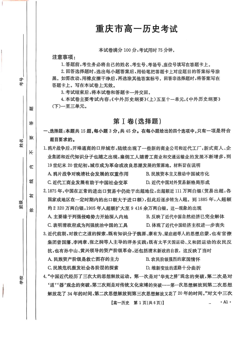 重庆市多校联考2024-2025学年高一下学期期中考试历史+答案