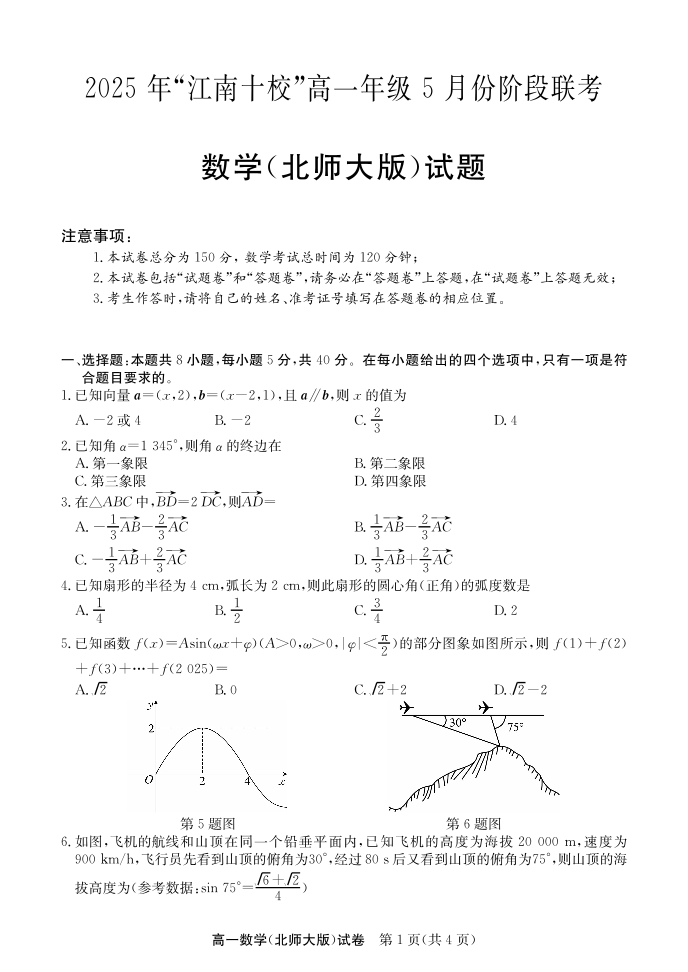 安徽省“江南十校”2024-2025学年高一下学期5月份阶段联考数学(北师大版)