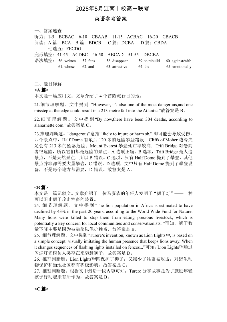 安徽省“江南十校”2024-2025学年高一下学期5月份阶段联考英语答案
