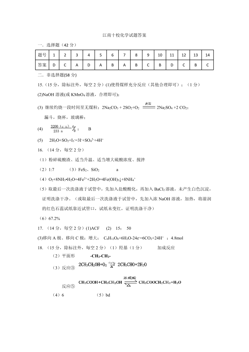 安徽省“江南十校”2024-2025学年高一下学期5月份阶段联考化学答案