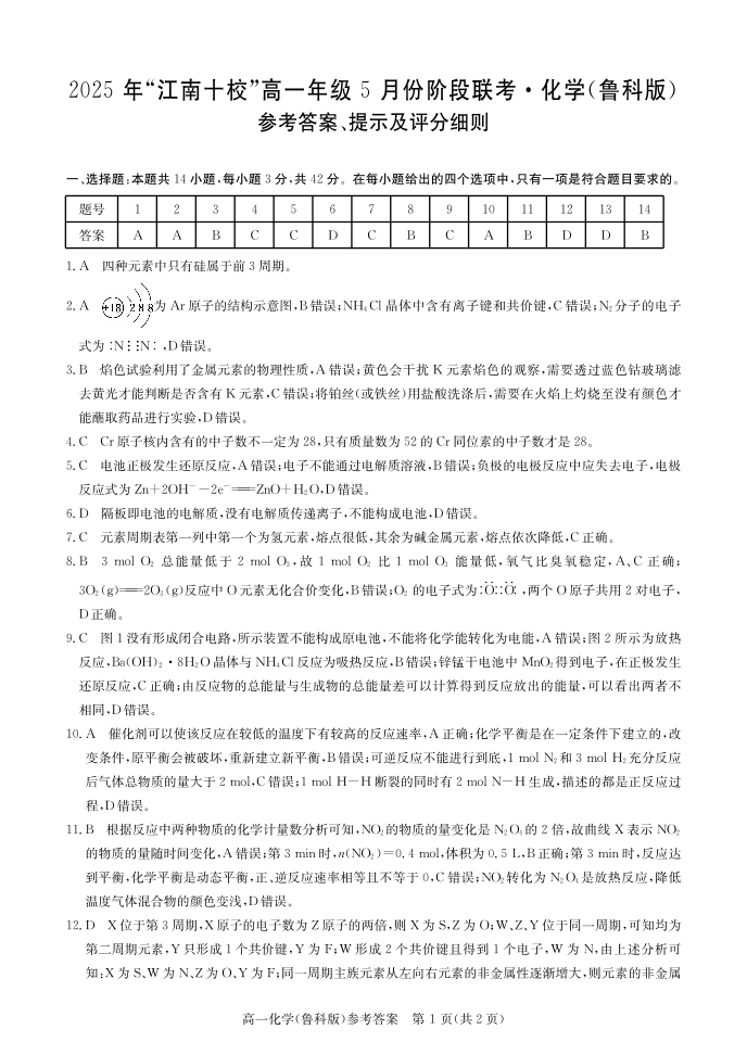安徽省“江南十校”2024-2025学年高一下学期5月份阶段联考化学答案(鲁科版)