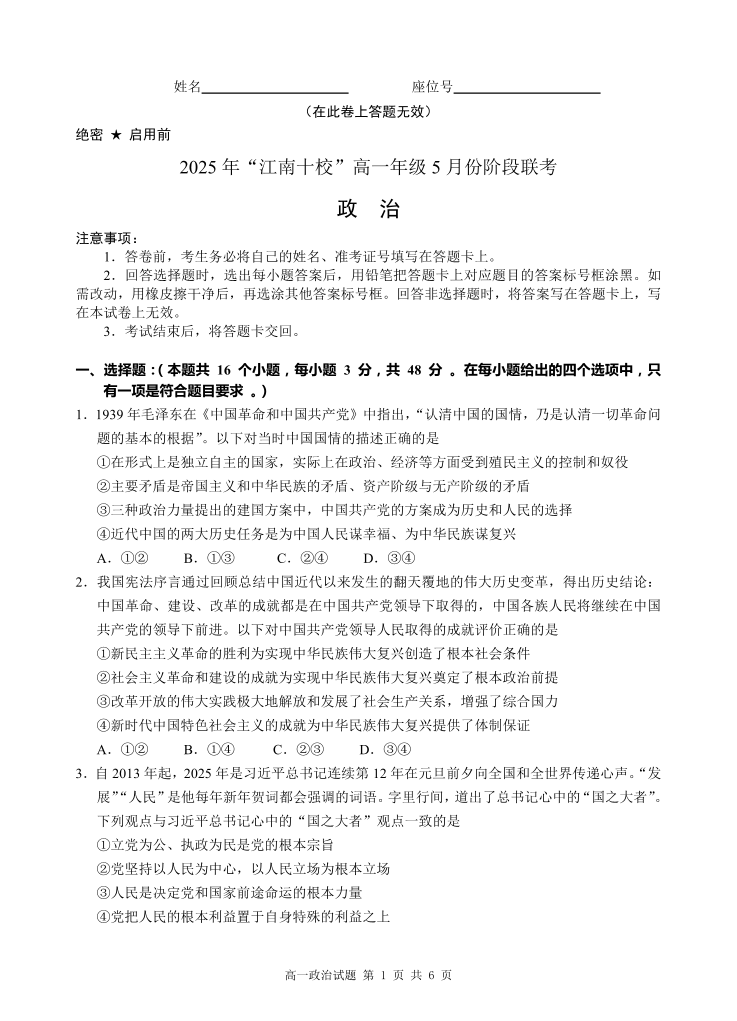 安徽省“江南十校”2024-2025学年高一下学期5月份阶段联考政治