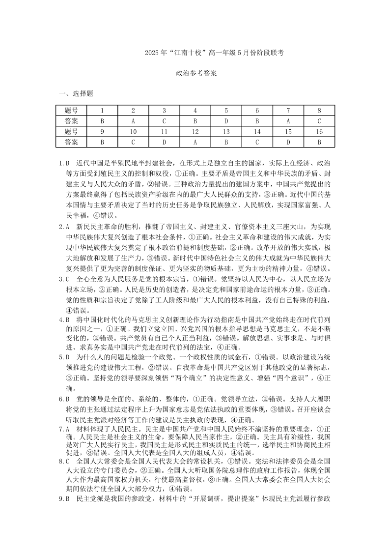安徽省“江南十校”2024-2025学年高一下学期5月份阶段联考政治答案