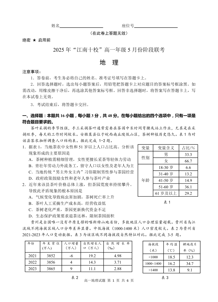 安徽省“江南十校”2024-2025学年高一下学期5月份阶段联考地理