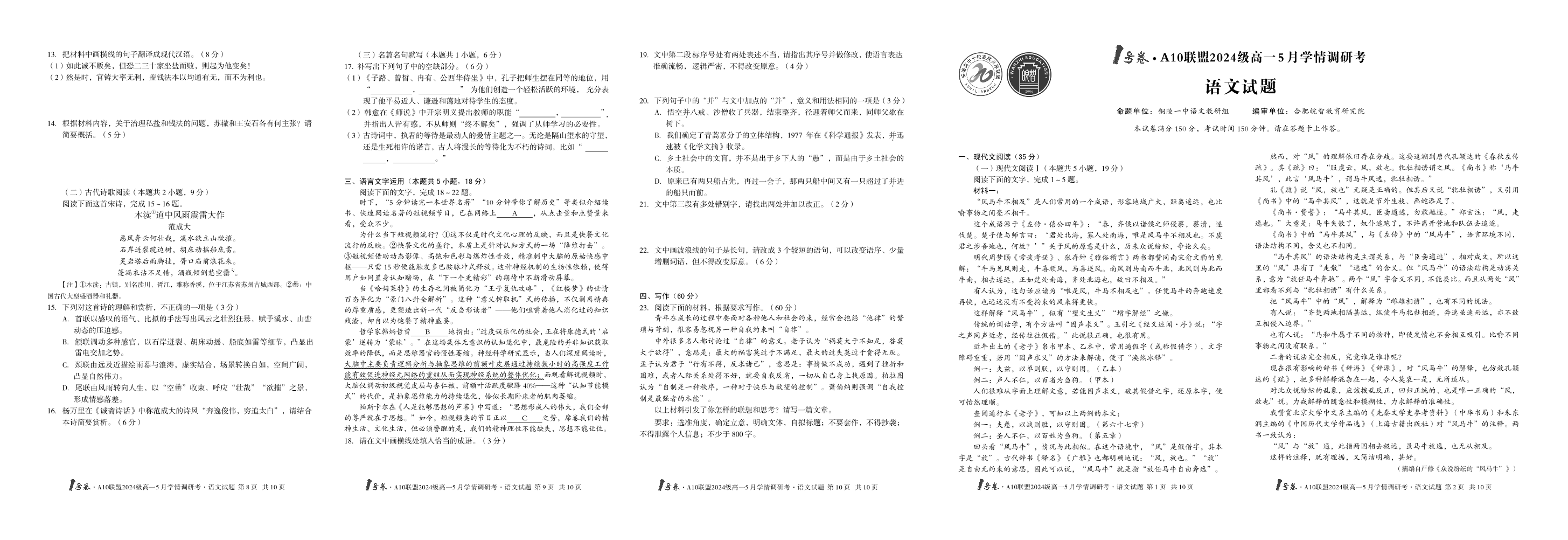 安徽省1号卷·A10联盟2024级高一5月学情调研考语文