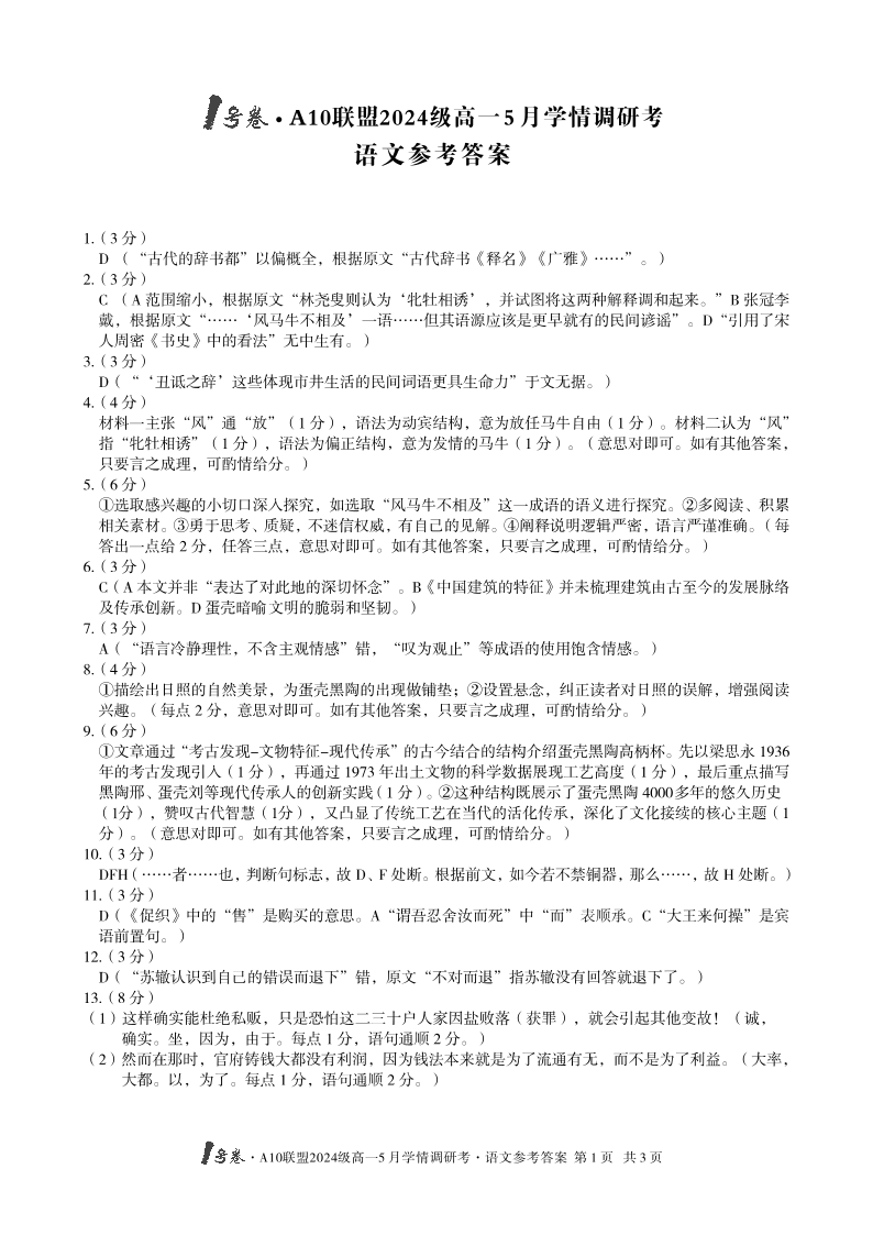 安徽省1号卷·A10联盟2024级高一5月学情调研考语文答案