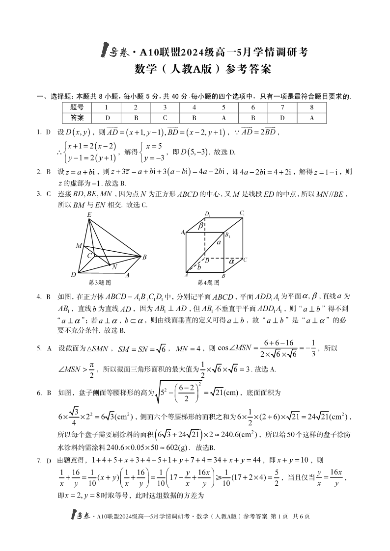 安徽省1号卷·A10联盟2024级高一5月学情调研考数学人教A版答案