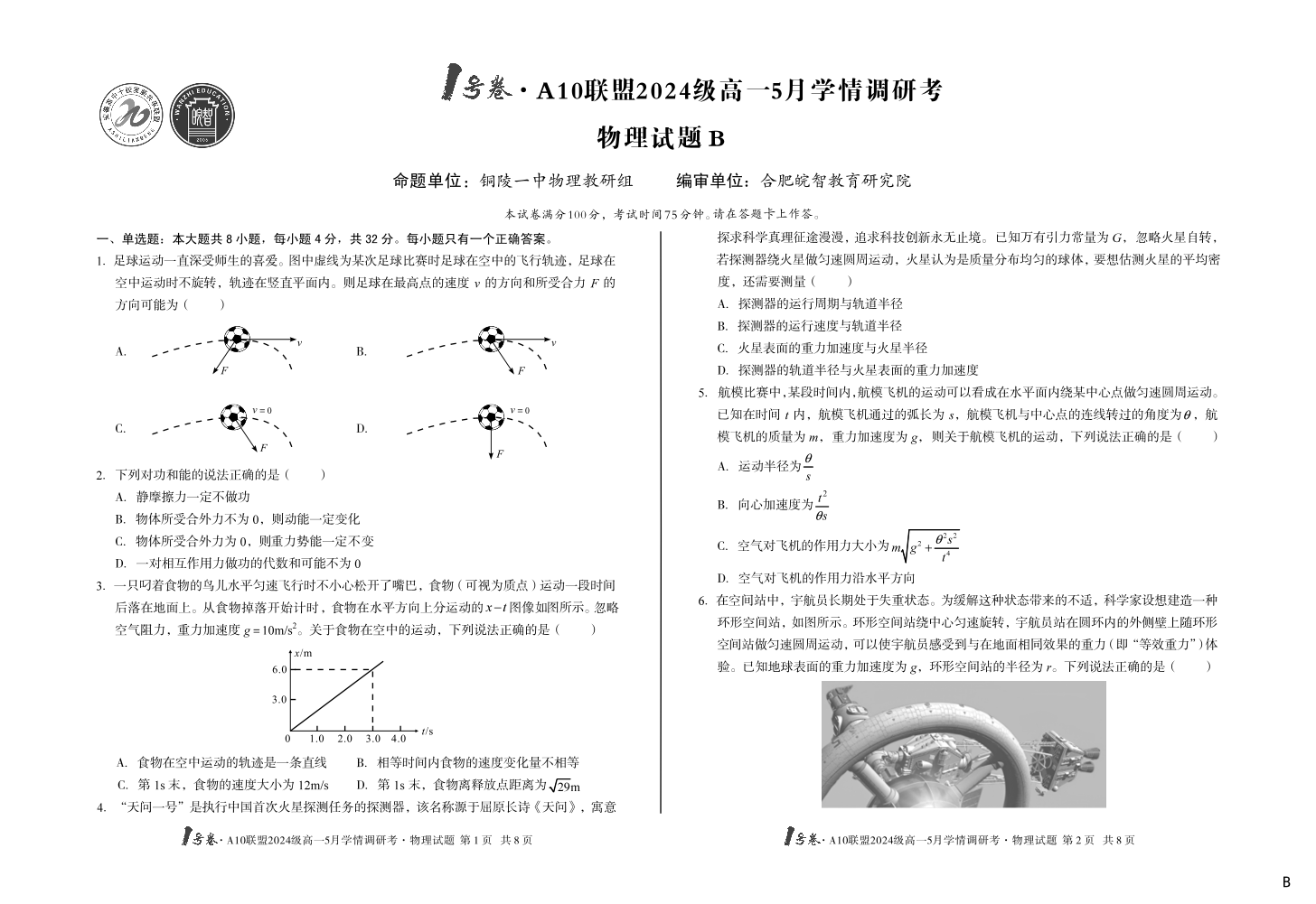安徽省1号卷·A10联盟2024级高一5月学情调研考物理(B卷)