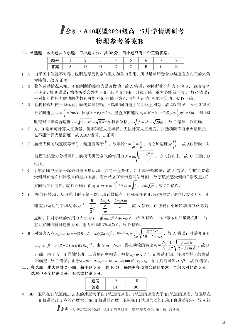 安徽省1号卷·A10联盟2024级高一5月学情调研考物理(B卷)答案
