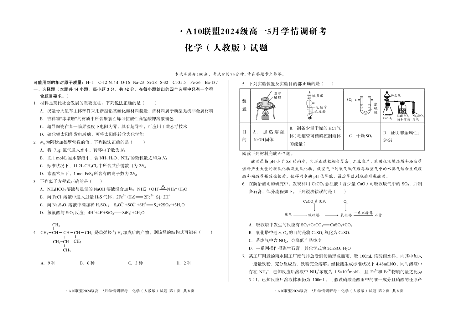 安徽省1号卷·A10联盟2024级高一5月学情调研考化学