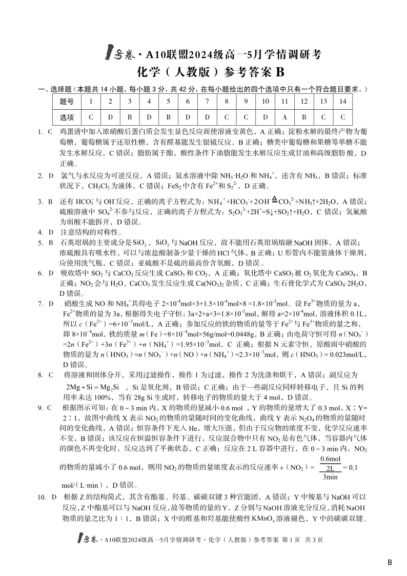 安徽省1号卷·A10联盟2024级高一5月学情调研考化学(B卷)答案