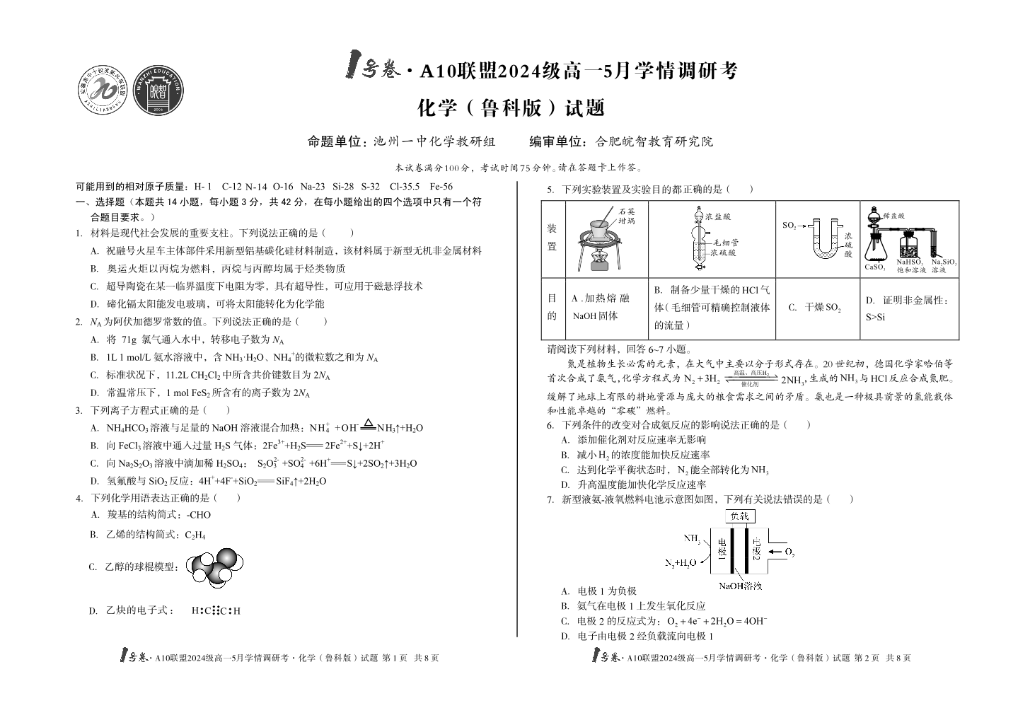 安徽省1号卷·A10联盟2024级高一5月学情调研考化学(鲁科版)