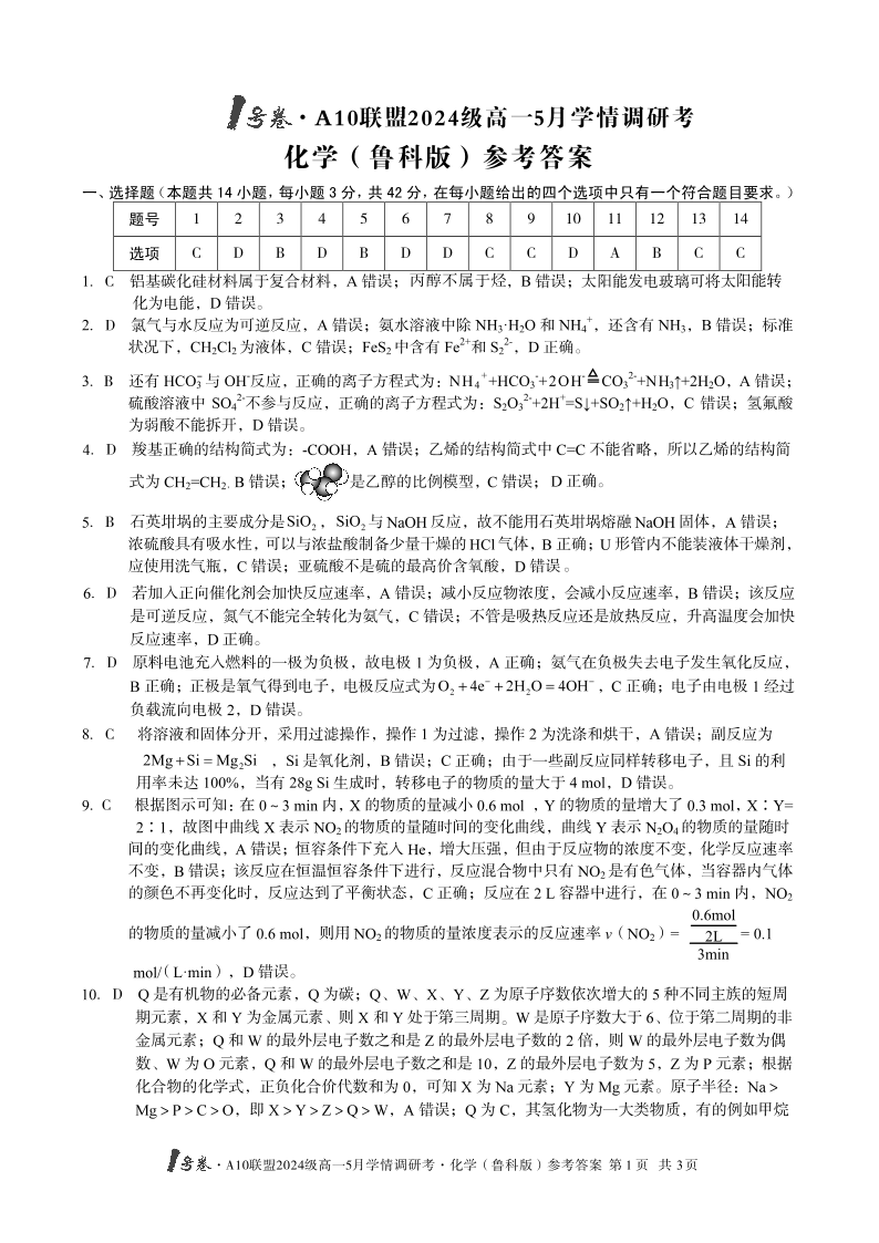 安徽省1号卷·A10联盟2024级高一5月学情调研考化学(鲁科版)答案