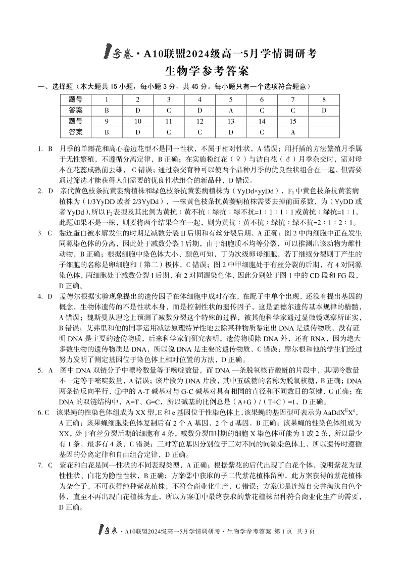 安徽省1号卷·A10联盟2024级高一5月学情调研考生物答案