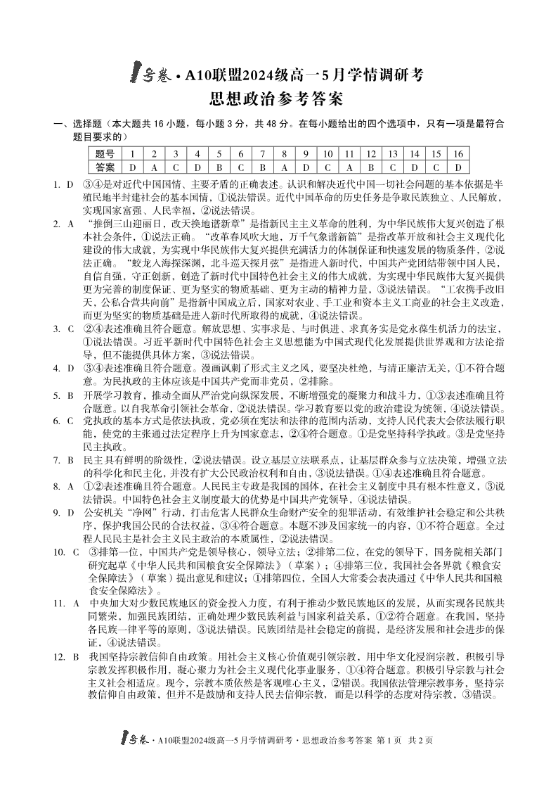 安徽省1号卷·A10联盟2024级高一5月学情调研考政治答案