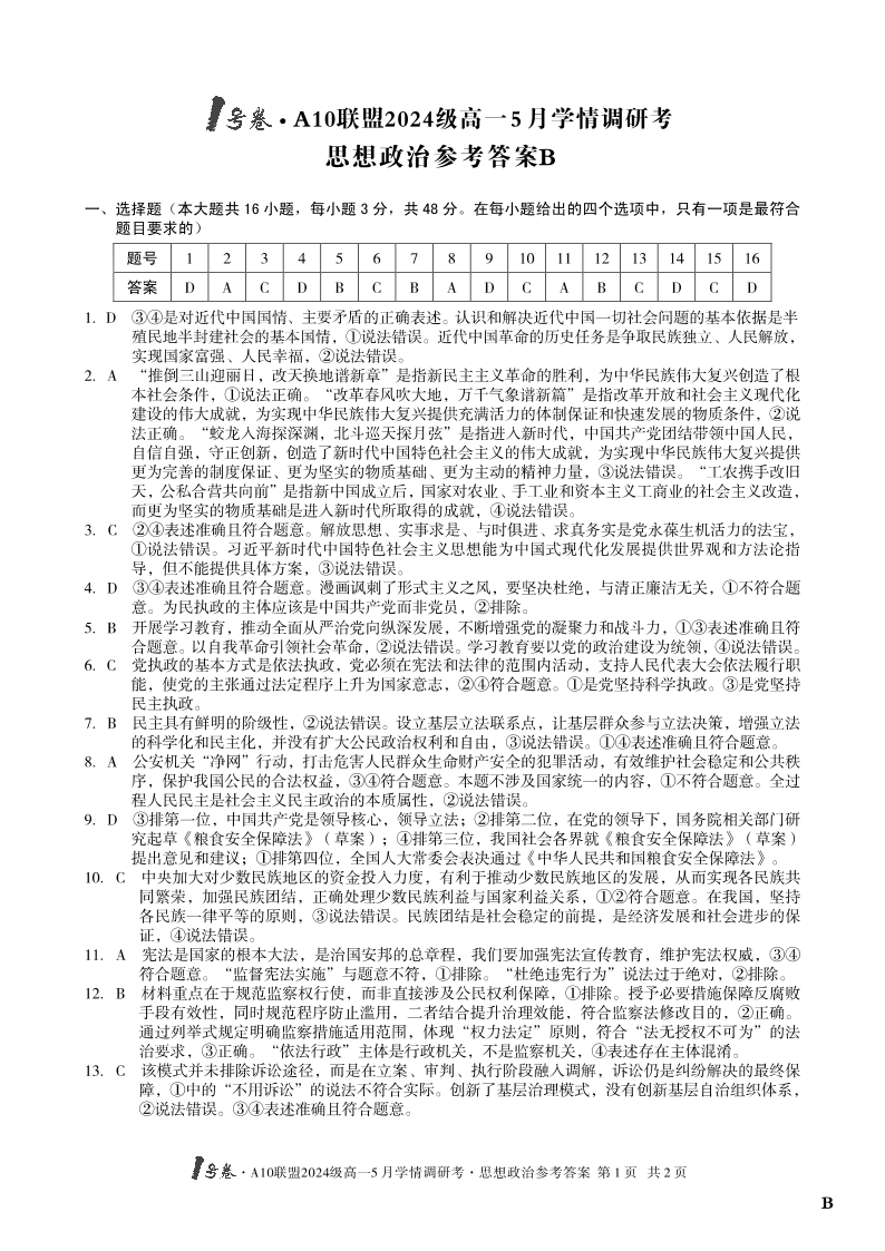 安徽省1号卷·A10联盟2024级高一5月学情调研考政治(B卷)答案