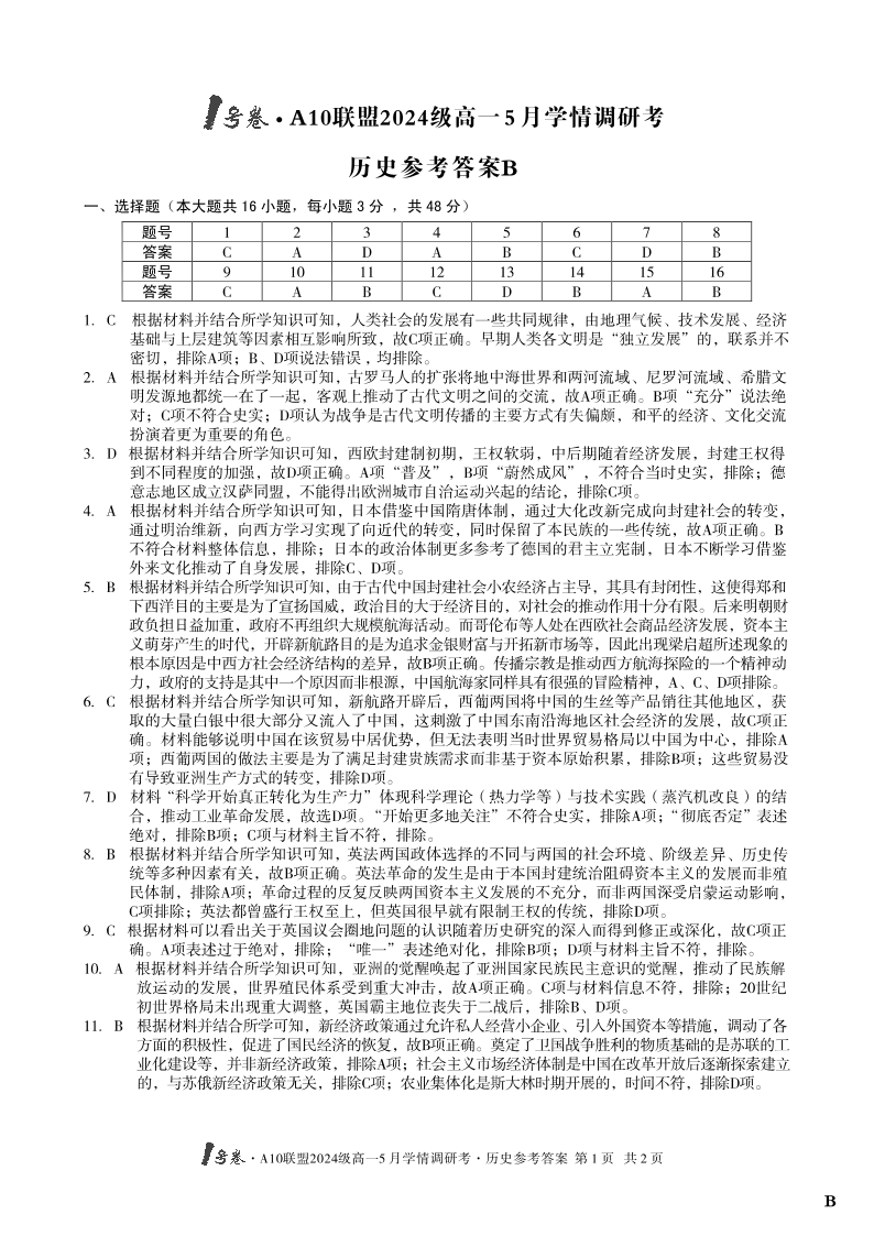 安徽省1号卷·A10联盟2024级高一5月学情调研考历史(B卷)答案