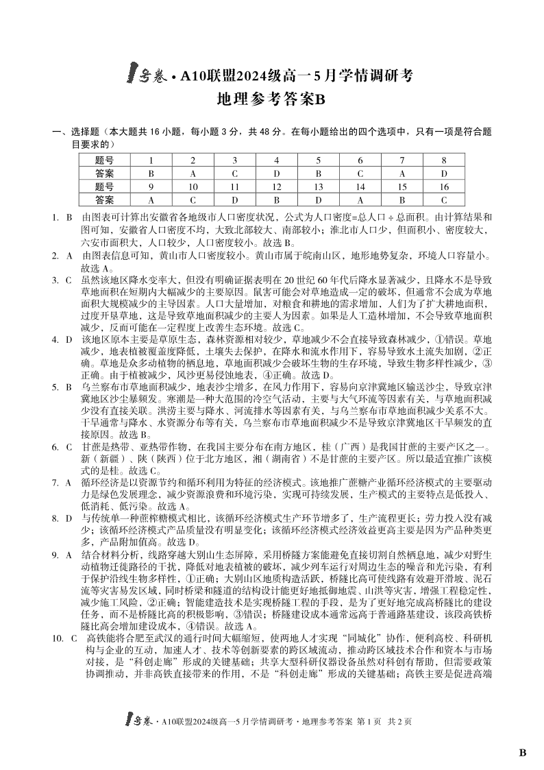 安徽省1号卷·A10联盟2024级高一5月学情调研考地理(B卷)答案