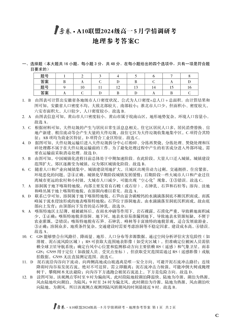 安徽省1号卷·A10联盟2024级高一5月学情调研考地理(C卷)答案
