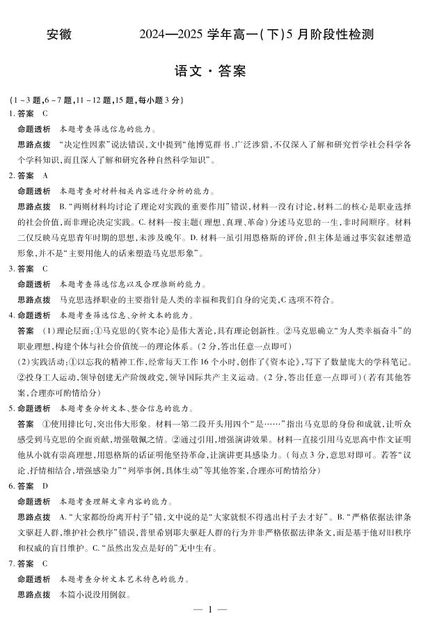 安徽省部分学校2024-2025学年高一下学期5月阶段性测试语文答案