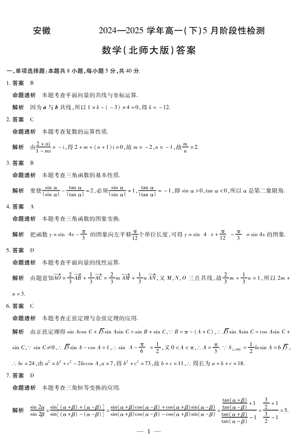 安徽省部分学校2024-2025学年高一下学期5月阶段性测试数学北师大版答案