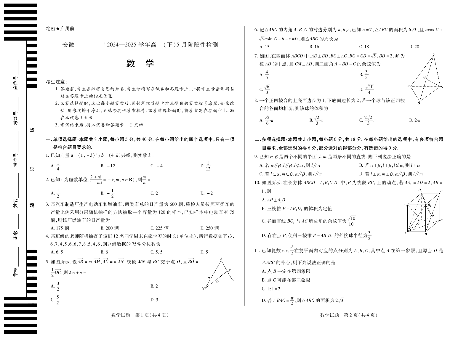安徽省部分学校2024-2025学年高一下学期5月阶段性测试数学(人教版)