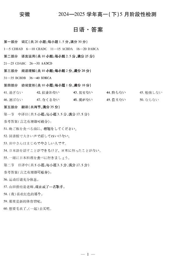 安徽省部分学校2024-2025学年高一下学期5月阶段性测试日语答案