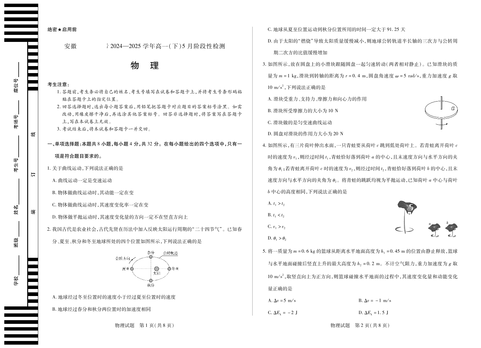 安徽省部分学校2024-2025学年高一下学期5月阶段性测试物理