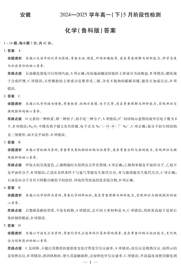 安徽省部分学校2024-2025学年高一下学期5月阶段性测试化学鲁科版答案