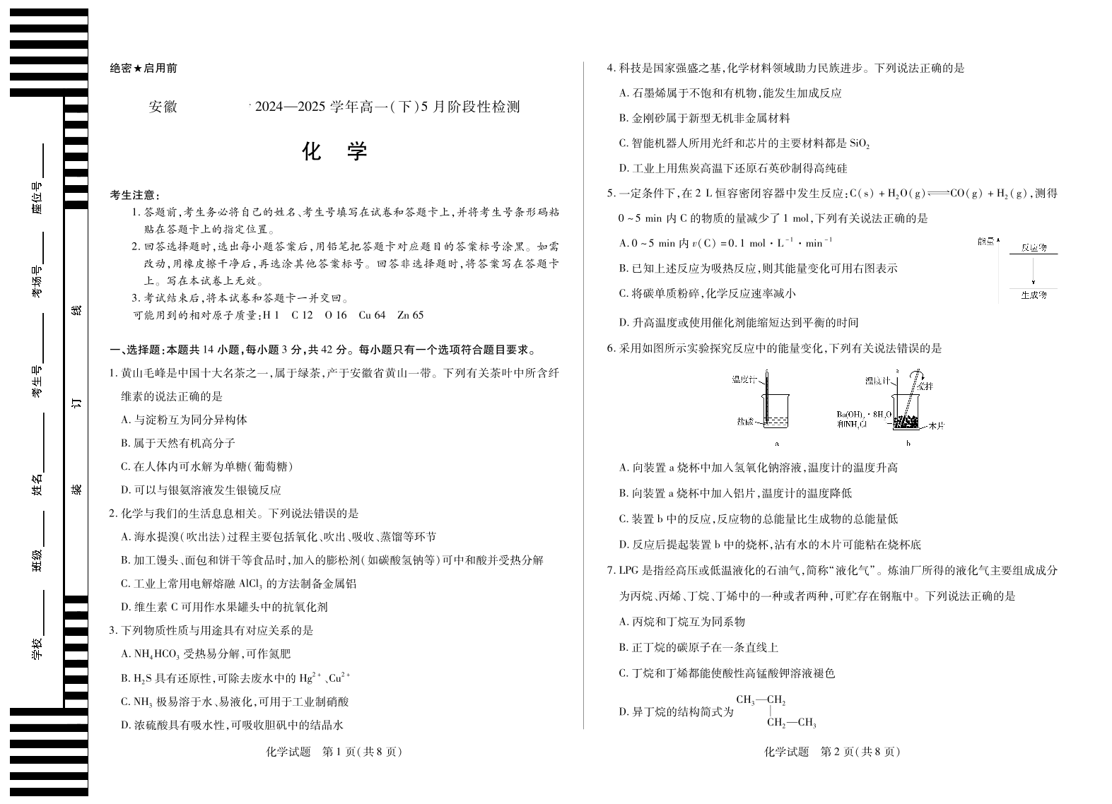 安徽省部分学校2024-2025学年高一下学期5月阶段性测试化学
