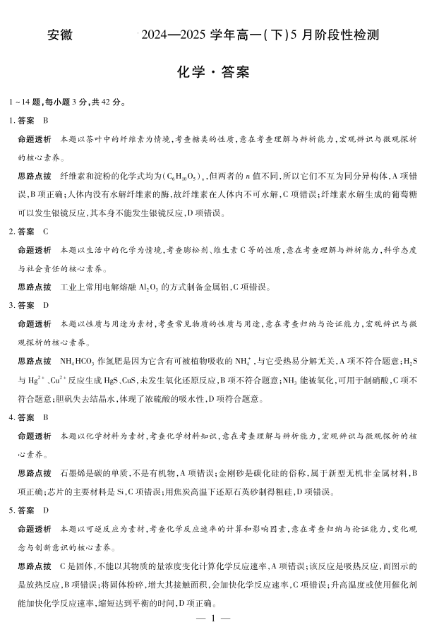 安徽省部分学校2024-2025学年高一下学期5月阶段性测试化学答案