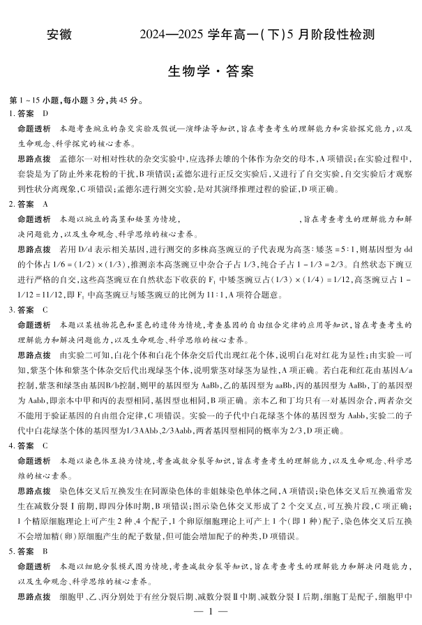 安徽省部分学校2024-2025学年高一下学期5月阶段性测试生物答案