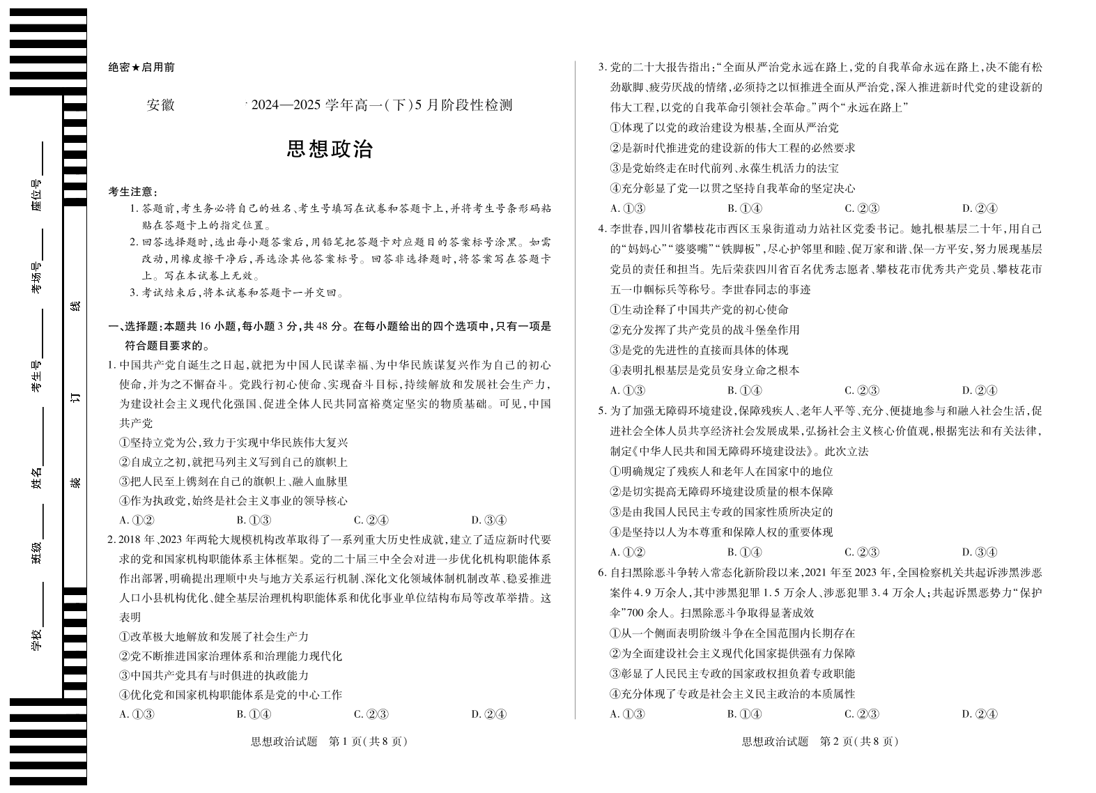 安徽省部分学校2024-2025学年高一下学期5月阶段性测试思想政治