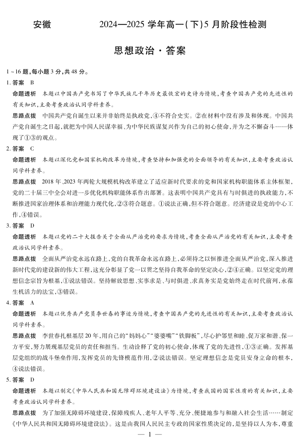 安徽省部分学校2024-2025学年高一下学期5月阶段性测试思想政治答案