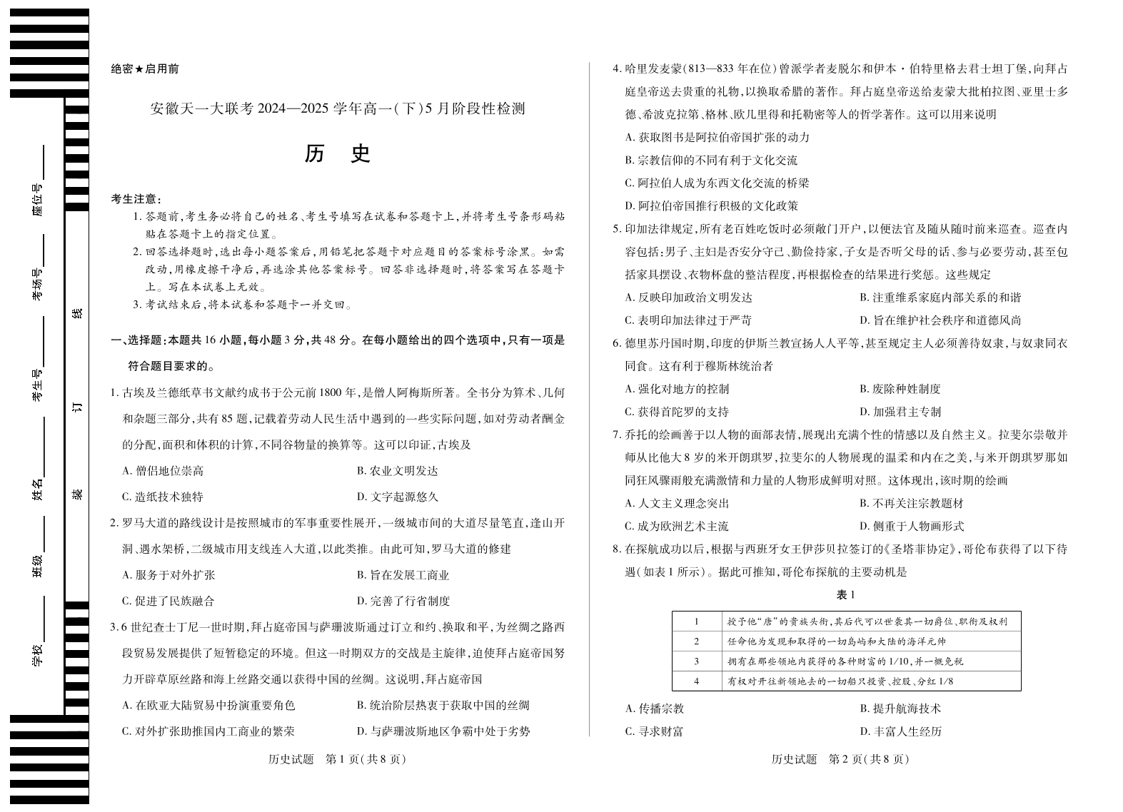 安徽省部分学校2024-2025学年高一下学期5月阶段性测试历史