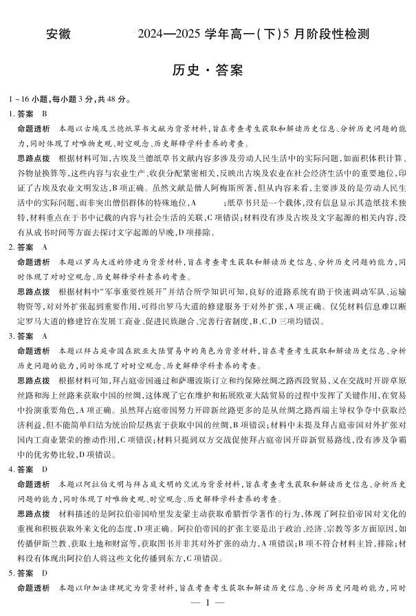 安徽省部分学校2024-2025学年高一下学期5月阶段性测试历史答案