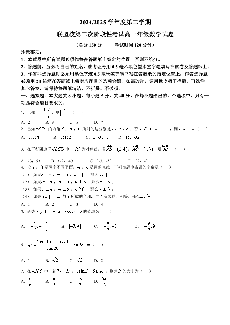 江苏省盐城市五校联盟2024-2025学年高一下学期5月第二次阶段性考试数学+答案