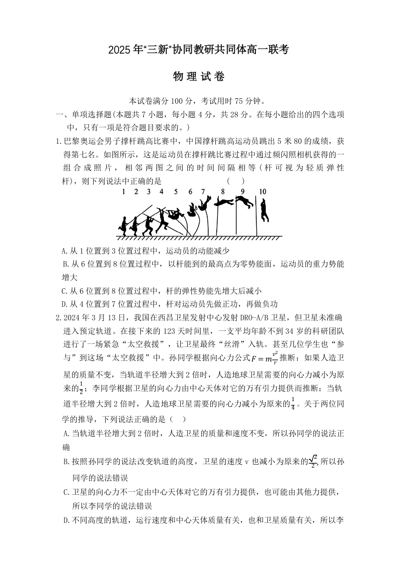 江西省三新协同教研共同体2024-2025学年高一下学期5月联考物理+答案