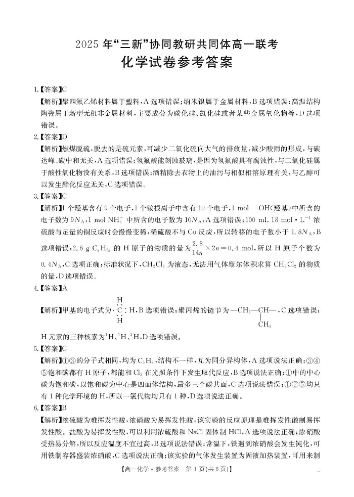 江西省三新协同教研共同体2024-2025学年高一下学期5月联考化学答案