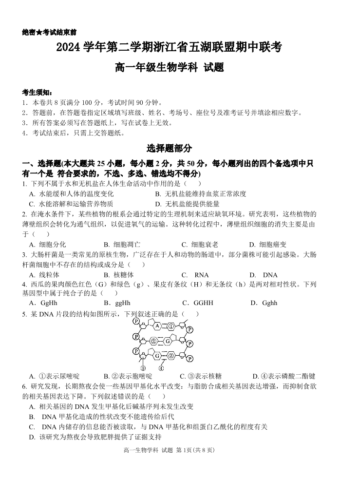 浙江省五湖联盟2024-2025学年高一下学期期中联考试题生物+答案