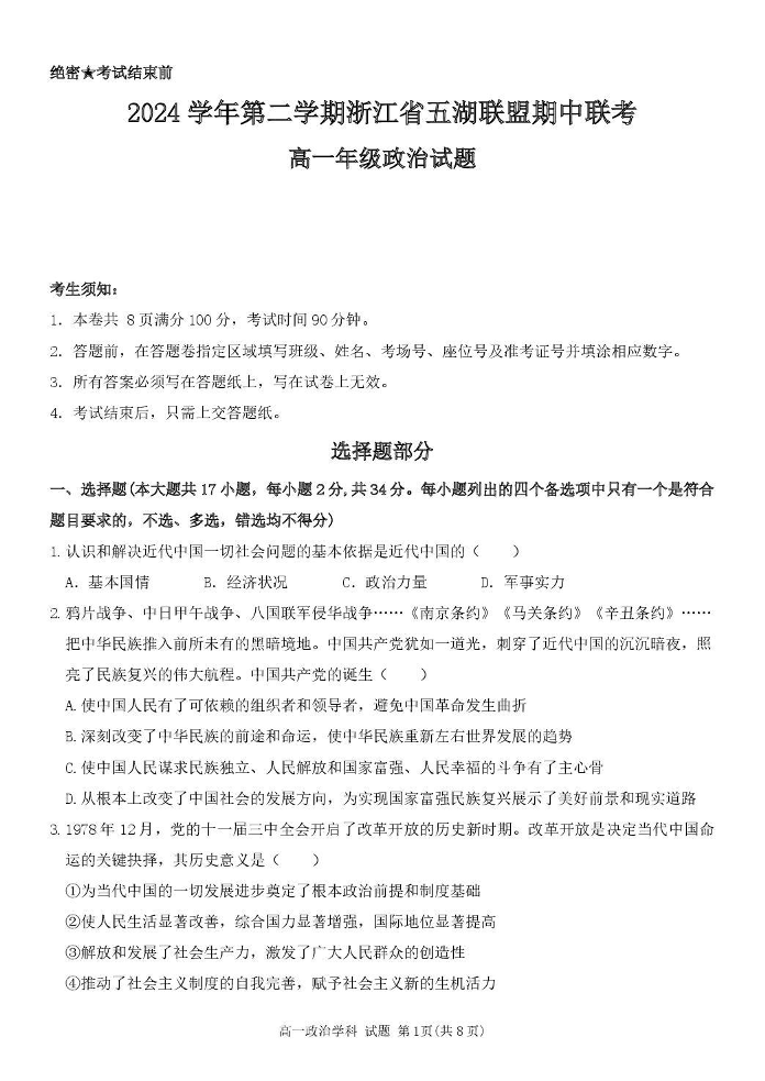 浙江省五湖联盟2024-2025学年高一下学期期中联考试题政治+答案